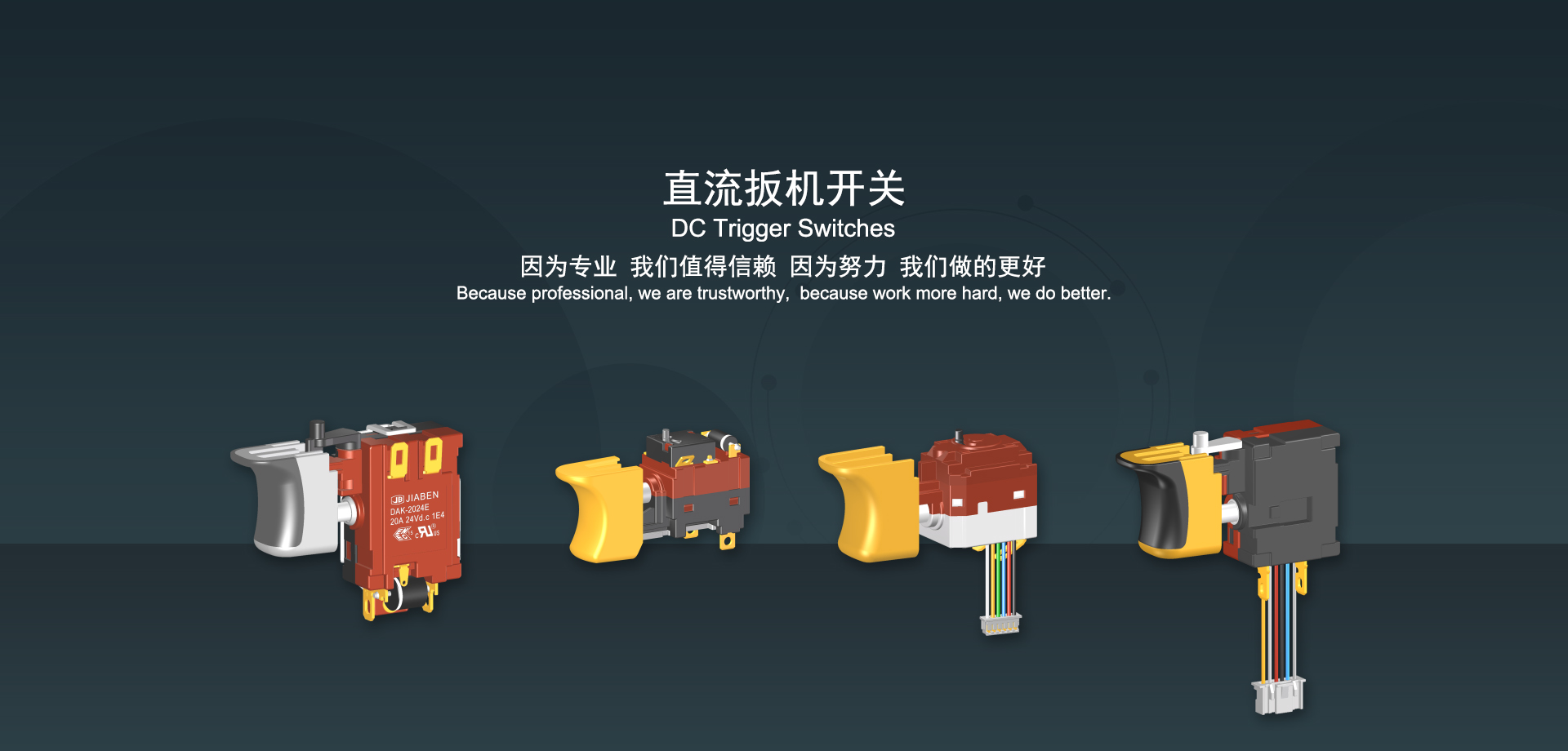 浙江佳奔電子有限公司始建于1986年,坐落于浙江省樂清市虹橋鎮(zhèn)東電子信息產(chǎn)業(yè)園內(nèi),現(xiàn)有職工700多人,資產(chǎn)總額超3億元。公司主要經(jīng)營“JIABEN”牌微動(dòng)開關(guān)、蹺板開關(guān)、按鈕開關(guān)、扳機(jī)開關(guān)、調(diào)速開關(guān)和電位器開關(guān)等各類交、直流器具開關(guān)和各類交、直流線路板模塊等產(chǎn)品,主要應(yīng)用于交、直流電動(dòng)工具、電動(dòng)園林工具、清潔器具、家用電器和小型機(jī)床等行業(yè),是集產(chǎn)品設(shè)計(jì)、研發(fā)、制造、銷售和服務(wù)于一體的國家高新技術(shù)企業(yè)。JIABEN was founded in 1986, located in East Electronic Information Industry Park, Hongqiao Town, Yueqing City, Zhejiang Proviance, existing staff more than 700 peoples, more than 300 million RMB worth of assets. Company is mainly engaged in "JIABEN" brand Micro Switch, Rocker Switch, Push-button Switch, Trigger Switch, Speed Regulating Switch, Potentiometer Switch and other kinds of appliance switch and all kinds of AC or DC circuit board module, such as more than 100 series, 8000 kinds of models of products, mainly used in AC or DC Power-tools, Power Gardening Tools, Cleaning Appliances, Household Appliances and Small Machine Tool and other industries, is the collection product design, research and development, manufacturing, sales and service in one of the national high and new technology enterprise.